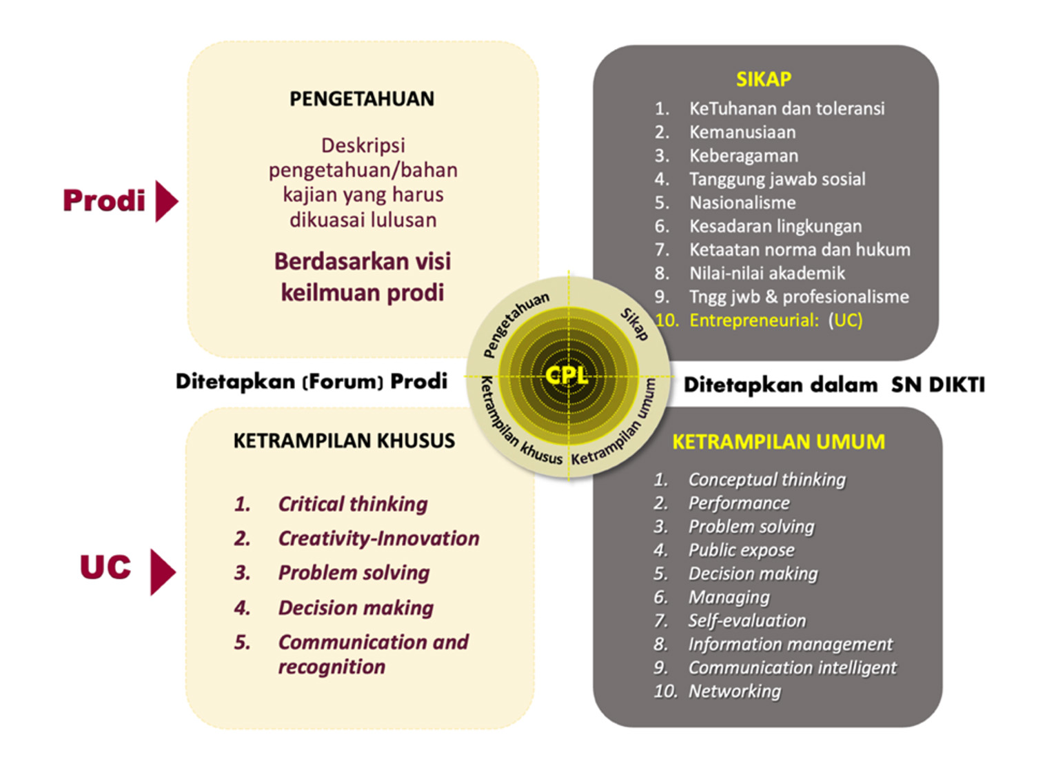 Capaian pembelajaran lulusan disusun dengan standar minimal berdasarkan jenjang kualifikasi KKNI yang telah dirumuskan oleh SN-DIKTI. Rumusan CPL terdiri dari “Sikap”, “keterampilan umum’, “keterampilan khusus”, dan “pengetahuan”.